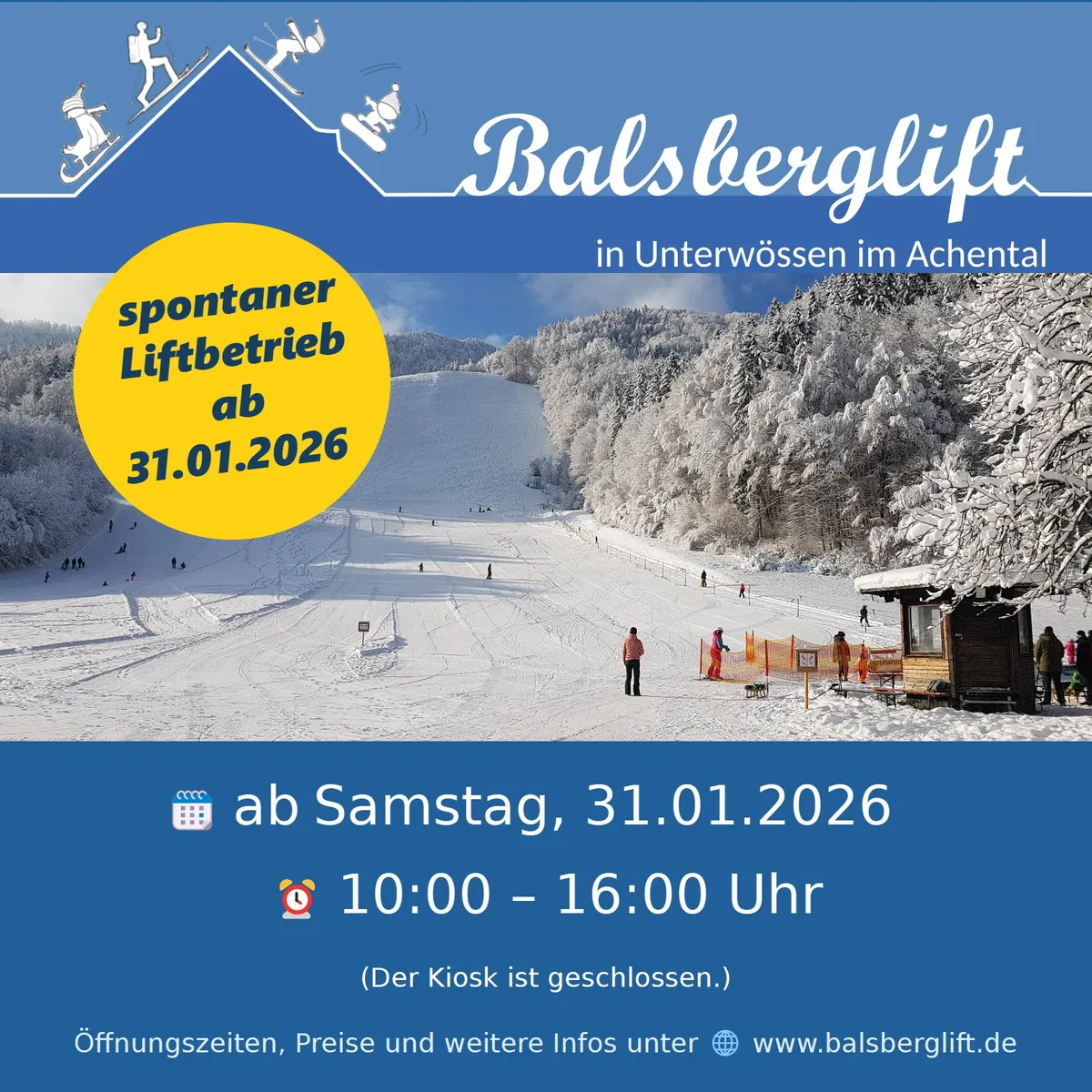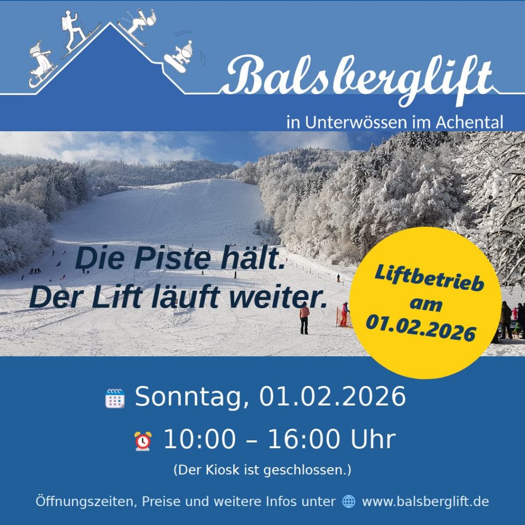 Sehr spontan öffnet der Balsberglift am Samstag den 31.Januar 2026! Ab 10:00 Uhr hat der kleine Balsberglift wieder bis 16:00 Uhr geöffnet.
